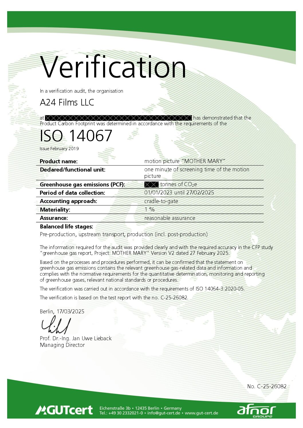 Verification A24 Audit on Mother Mary by David Lowery (Klick auf Bild führt zu voller Auflösung)